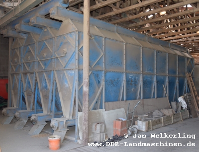986. Weitere technische Daten: L/ B/ H 11.500/ 6400/ 6000 mm (ohne Zyklon und Elevator, 3 Aufsätze), Fassungsvermögen minimal: 4x8 Trichter = 32 m³, maximal: 4x8 Trichter + 3x4x8 Aufsätze = 128 m³, Richtpreis 51.200 bis 74.100 M je nach Fassungsvermögen* |
