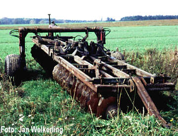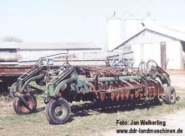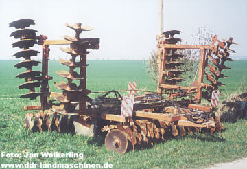 - 12 km/h liegen, wobei dann eine Leistung von 7 ha/h erreicht wird. Die Transportbreite mit eingeklappten Seitenteilen beträgt immer noch stolze 2,94 m. Einige dieser russischen Scheibeneggen sind auch heute noch im Einsatz, wenn auch