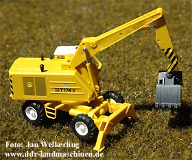 | Passend zum T 174-1 gibt es die Version T 174-2, also der Bagger mit Abstützung wie er ab 1976 hergestellt wurde. Wie beim "Einser" lassen sich auch hier die Ausleger, der Greifer und der Oberwagen bewegen bzw. drehen. Auch die Abstützung kann der Modellbahner vorbildgerecht nach unten klappen und so seinem Bagger einen sicheren Stand bei der Arbeit bieten. Die Auslegerkonfiguration entspricht der für den Baggerbetrieb üblichen Einstellung. Das Dach wurde, wie bei den ersten Fahrzeugen noch üblich, farblich in weiß abgesetzt und an der Tür das alte Weimar-Zeichen mit Schriftzug "T 174-2" angebracht. Auch die Beschriftung der Ausleger mit den Arbeitsschutzhinweisen ist korrekt wiedergegeben. Sicher sind auch weitere Versionen des T 174 in Vorbereitung. | ||